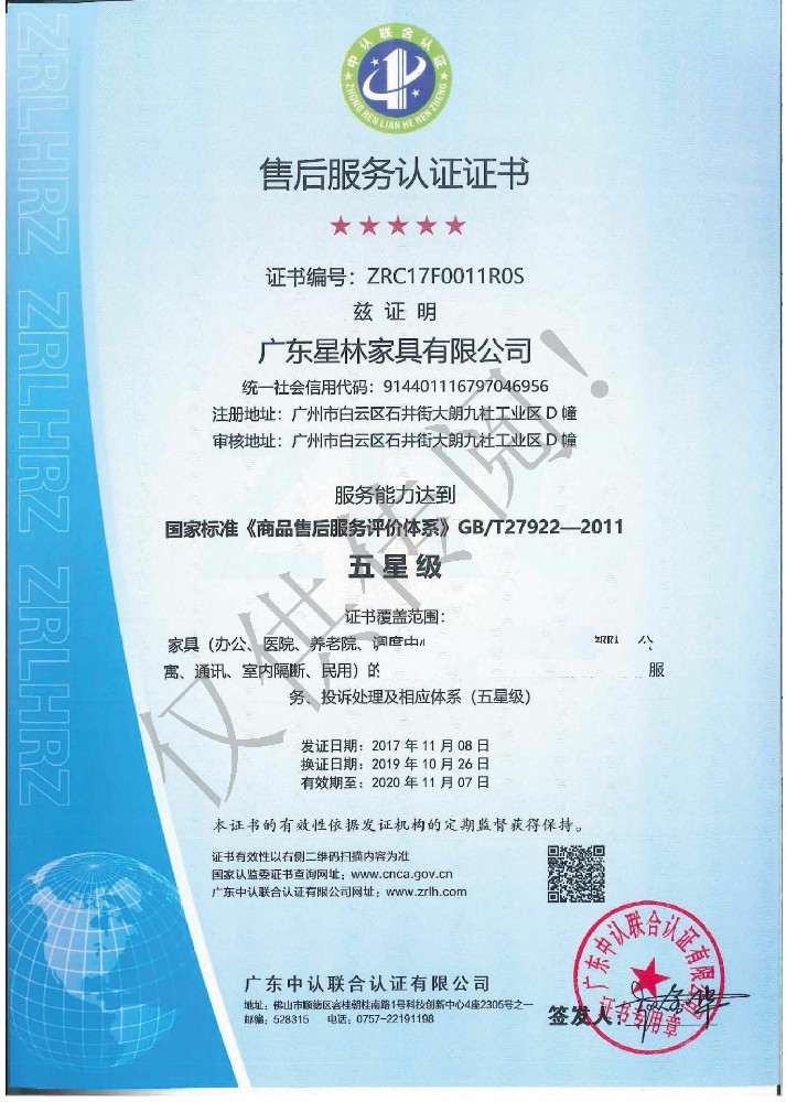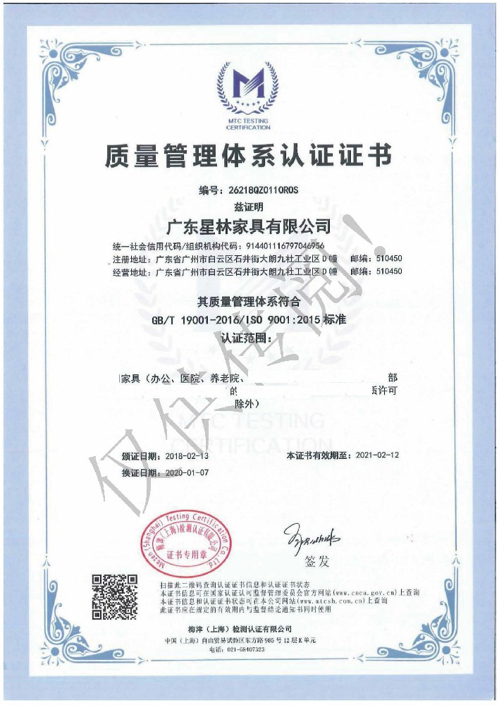廣東星林家具有限公司創建于家具盛世之期,專業致力于辦公家具、醫療家具、養老家具的開發、設計、生產。公司率先通過ISO9001質量管理體系認證和ISO14001環境管理體系認證及職業健康安全管理體系認證,從而獲得了中環聯合(北京)認證中心有限公司頒發的“中國環境標志產品認證證書(十環認證)”等。